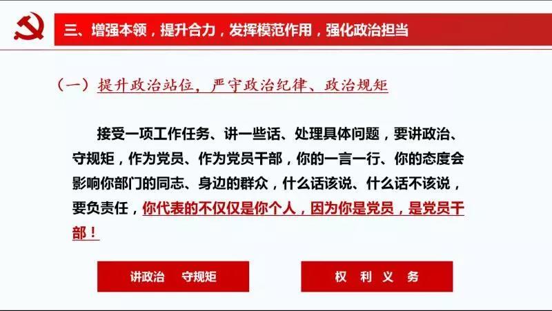 ![]() 结合活动主题,对全体党员干部增强本领、提升合力、发挥模范作用、强化政治担当提出明确要求。